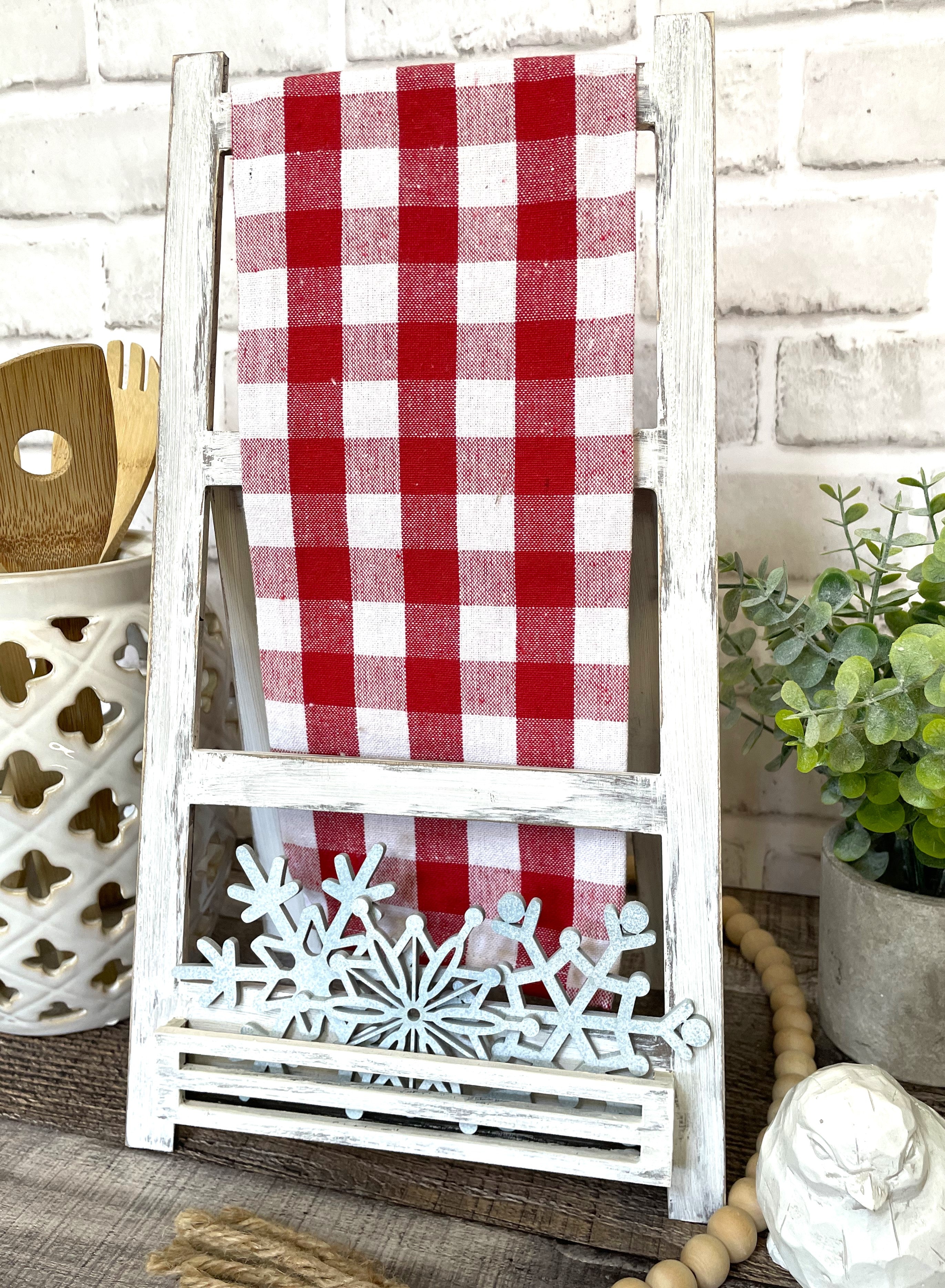 Wooden Tea Towel Stand perfect for displaying Tea Towels as well as Holiday Decor. Inserts are sold separately. Size is approximately 15.25" x 8.50".